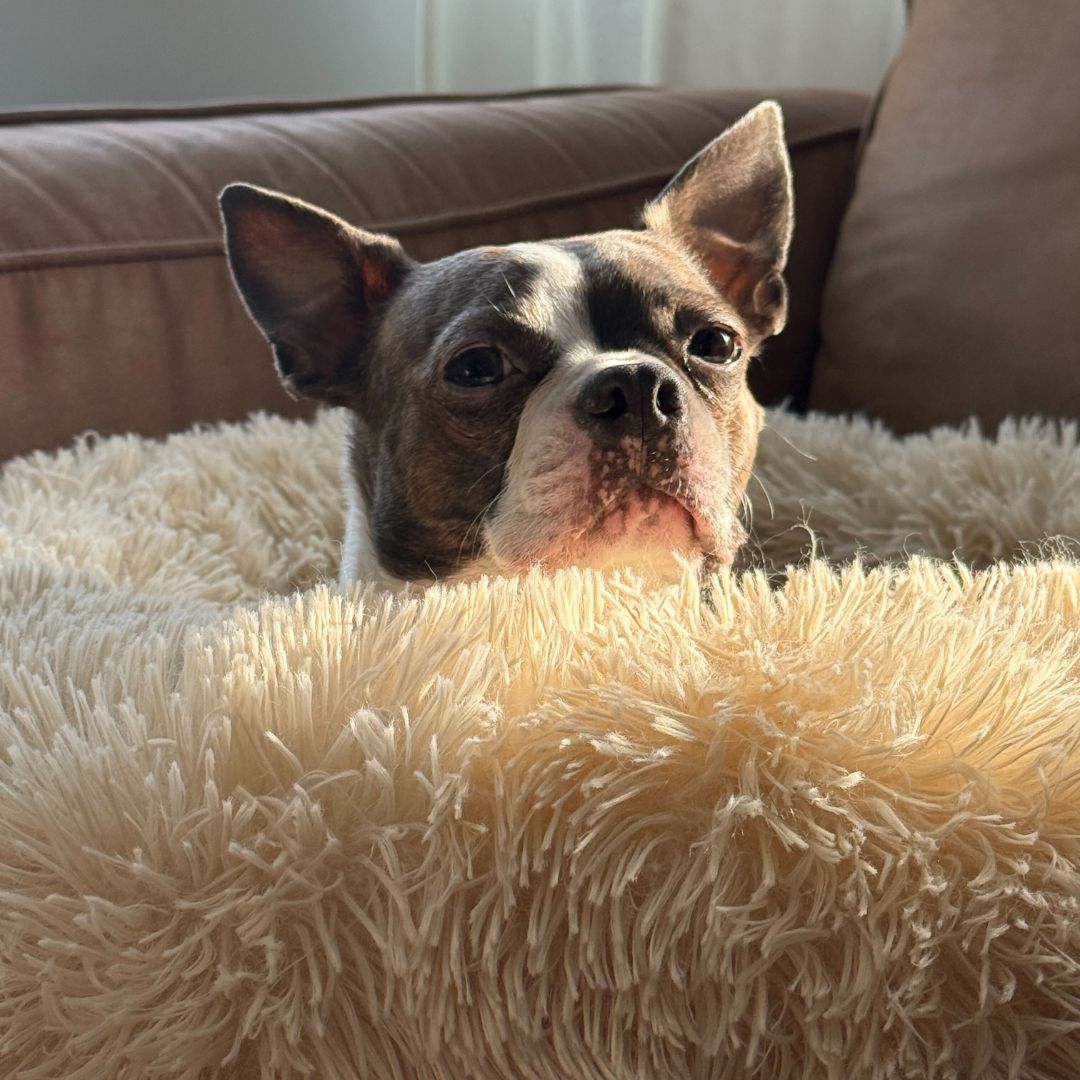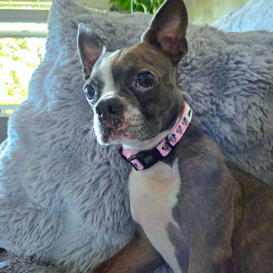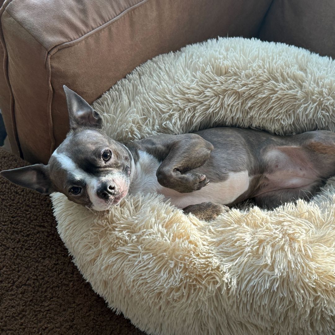 Day by day, Cameo has been learning to trust her new world. Shy and nervous, Cameo takes some time to warm up to unfamiliar people and experiences, but with her foster mom’s gentle encouragement, she has made big strides. The human bed is now Cameo’s bed, and she’s becoming more affectionate. Walks are still a work in progress, and her foster parents are helping her build more confidence.