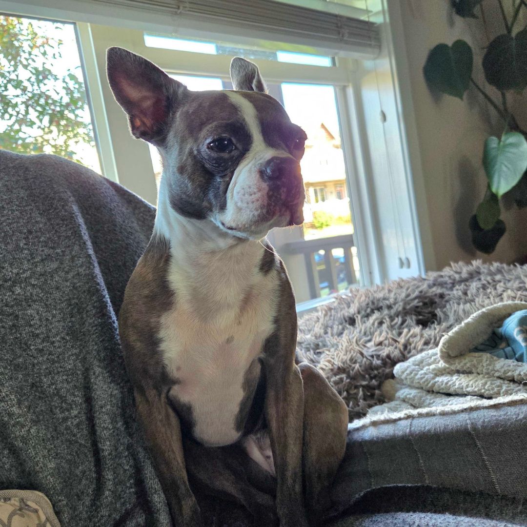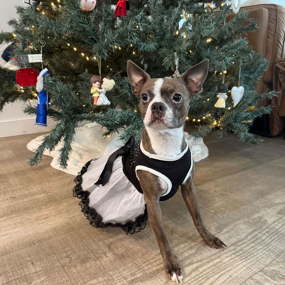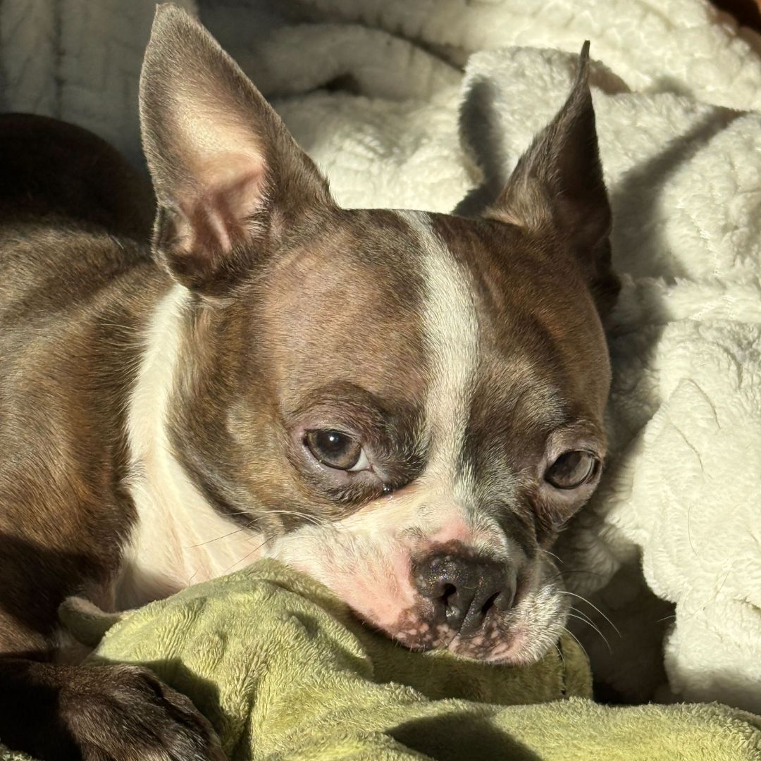 Day by day, Cameo has been learning to trust her new world. Shy and nervous, Cameo takes some time to warm up to unfamiliar people and experiences, but with her foster mom’s gentle encouragement, she has made big strides. The human bed is now Cameo’s bed, and she’s becoming more affectionate. Walks are still a work in progress, and her foster parents are helping her build more confidence.