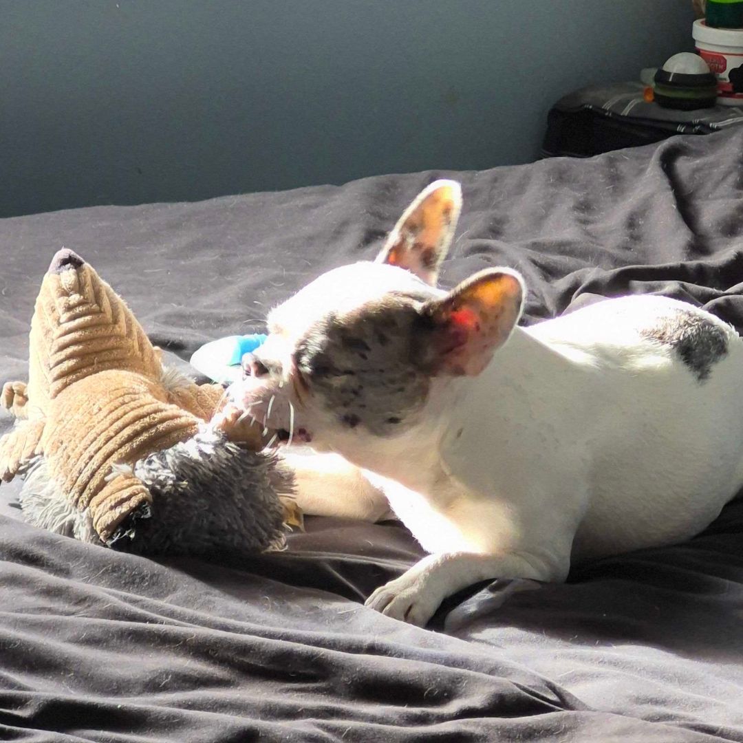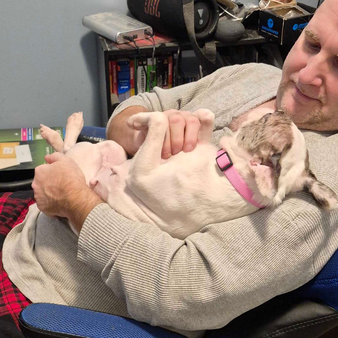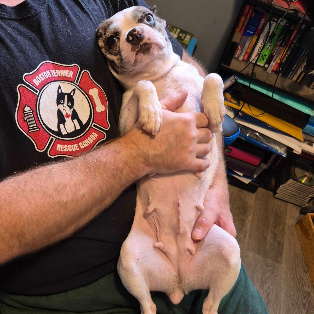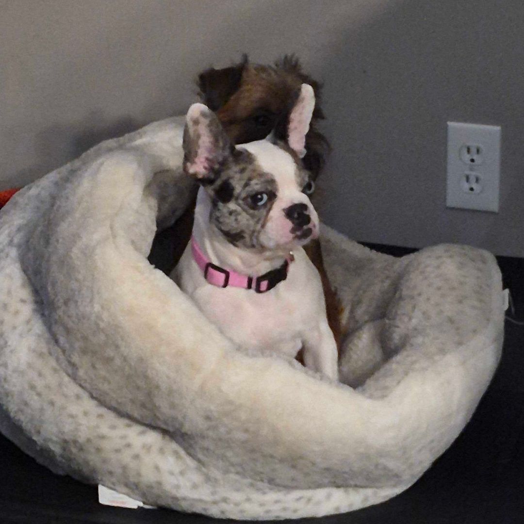This Boston Terrier-Frenchie mix is the kind of dog who doesn’t believe in personal space. If you sit down, she’s in your lap. If you lie down, she’s tucked up by your neck. If there’s a cozy spot beside you, Holly has already claimed it.