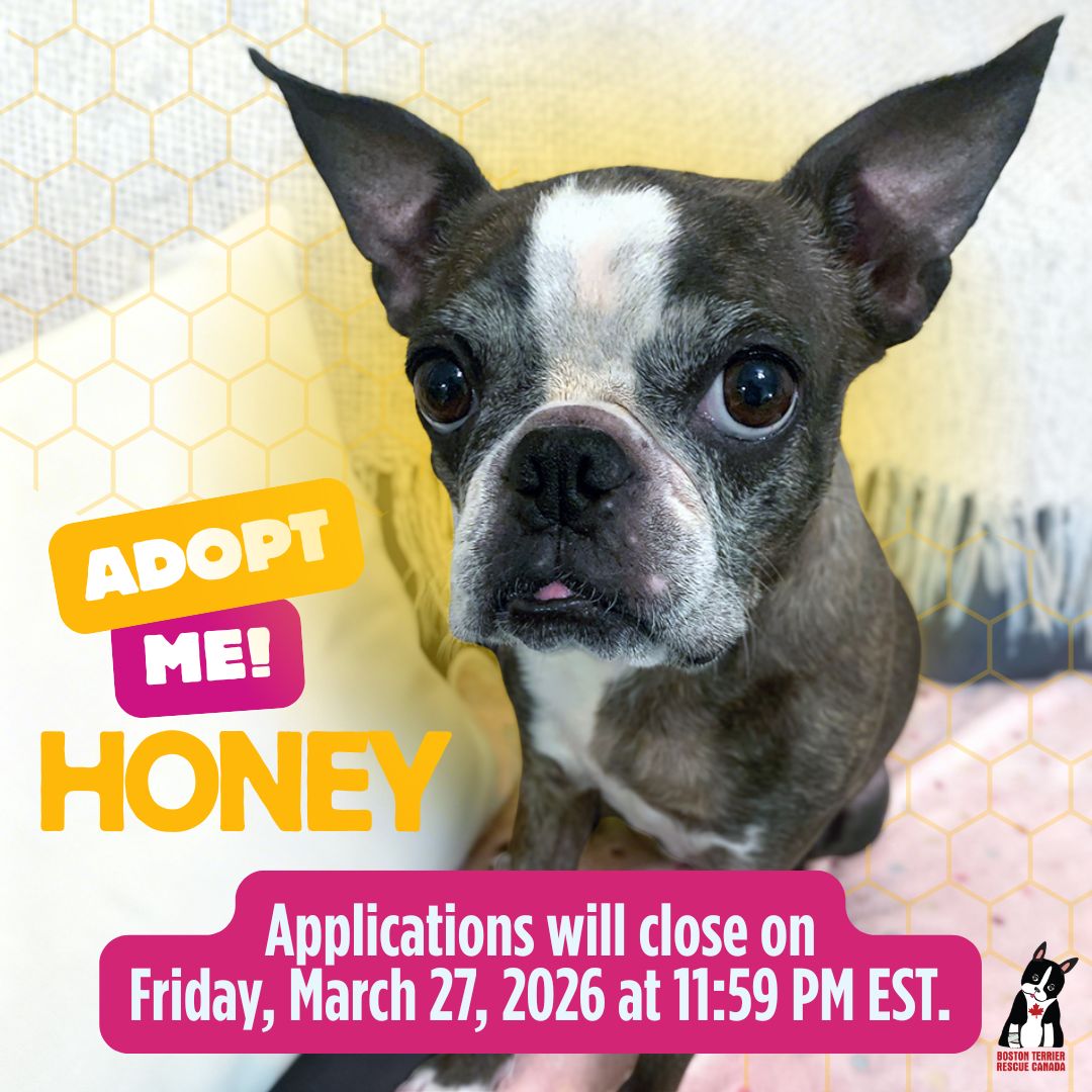 HONEY • SPAYED BOSTON TERRIER • AGE 7 • WEIGHT TBD • DOGS YES (similar size) • CATS ? • ADULT HOME • FOSTERED IN TORONTO, ON