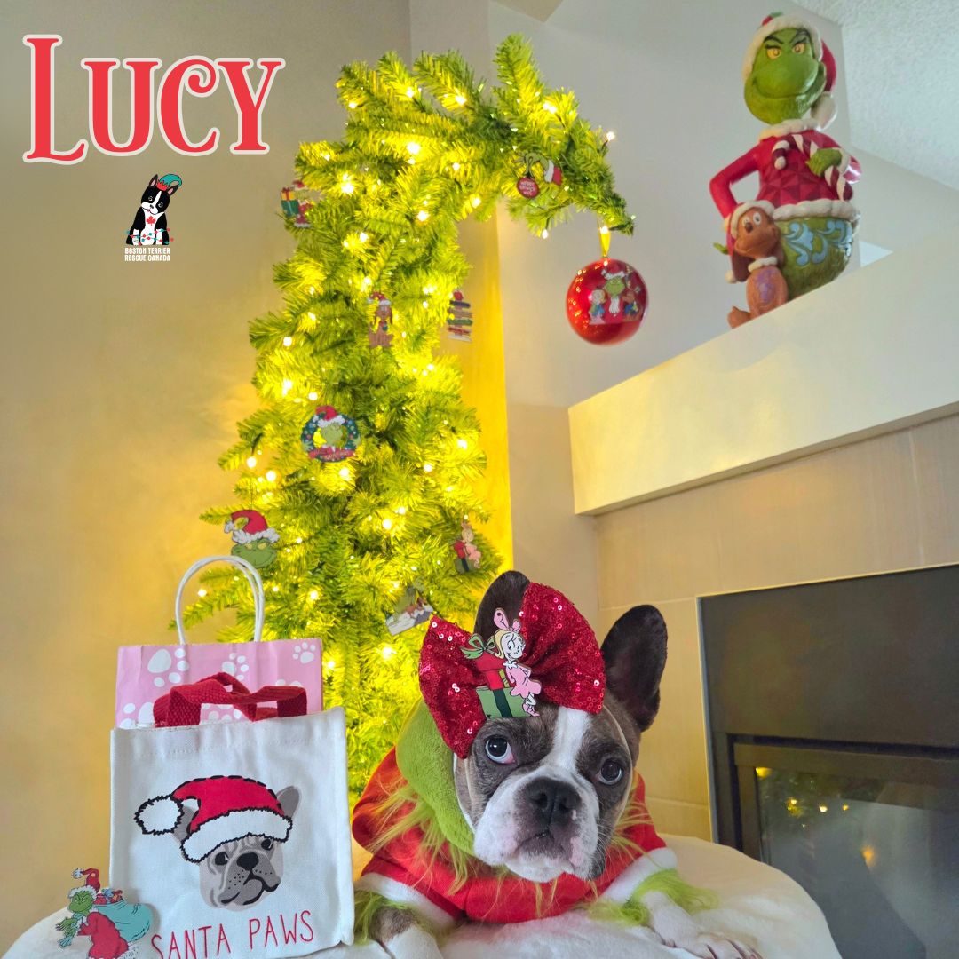 It’s me, Lucy – a two-year-old Boston Terrier-Frenchie mix in foster care. I’m writing this while wearing my Grinch costume and sitting in front of the Crumpit tree. I know I should probably be in a cute holiday outfit, but I picked this one for a very special reason: