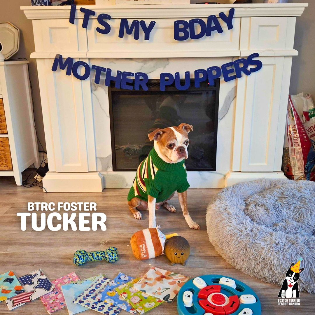 Tucker’s foster parents pulled out all the stops – they decorated, doted on and dedicated all their attention to Tucker. And that’s when Linc, the stealthy snatcher he is, pounced and stole the acorn stuffy right from under Tucker’s nose! Linc has invented a NEW game called ‘Acorn Launch: Fluffy Bed Edition.’ (We will share a video once Lincoln has worked out all the rules and perfected his technique.)